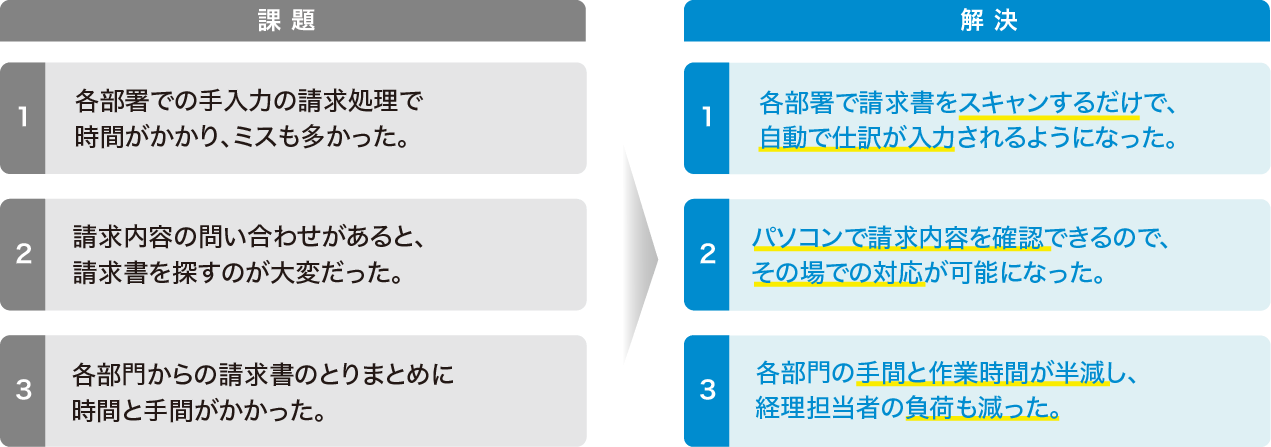 受領請求書サービス』の導入後は、本社内外の各部署が請求書をスキャンするだけで経理担当者が処理を始められ、すぐに経費計上ができるようになりました。今までかかっていた時間を一気に圧縮でき、担当者の残業も無くなりました」