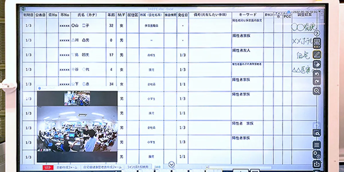 医療調整本部と県内6カ所の保健所をリコーインタラクティブホワイトボード(RICOH IWB)で繋ぎ、陽性者や自宅療養者の情報を相互で手書きで共有