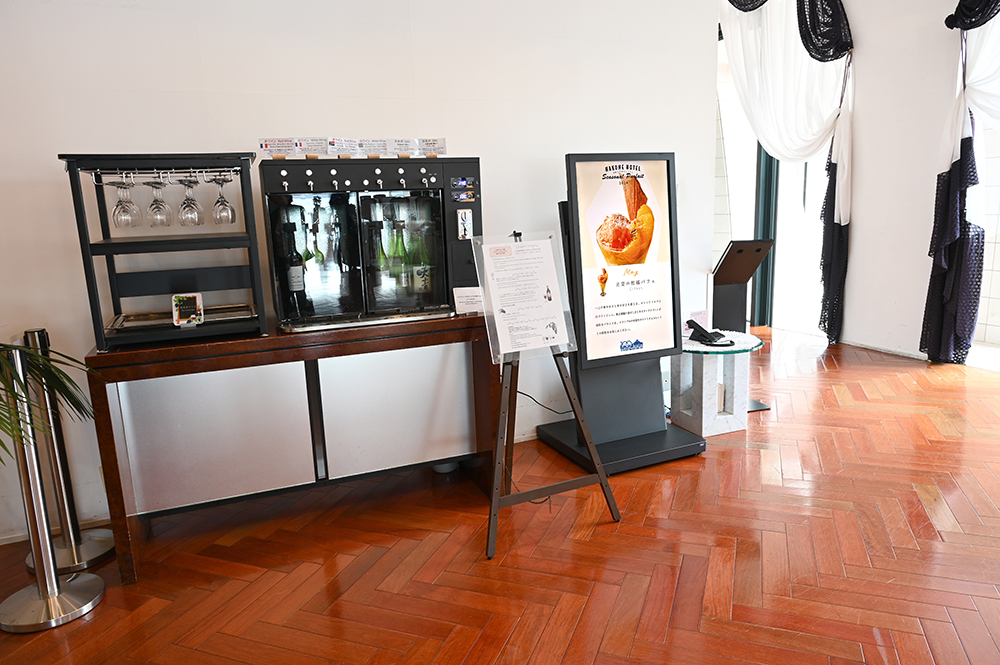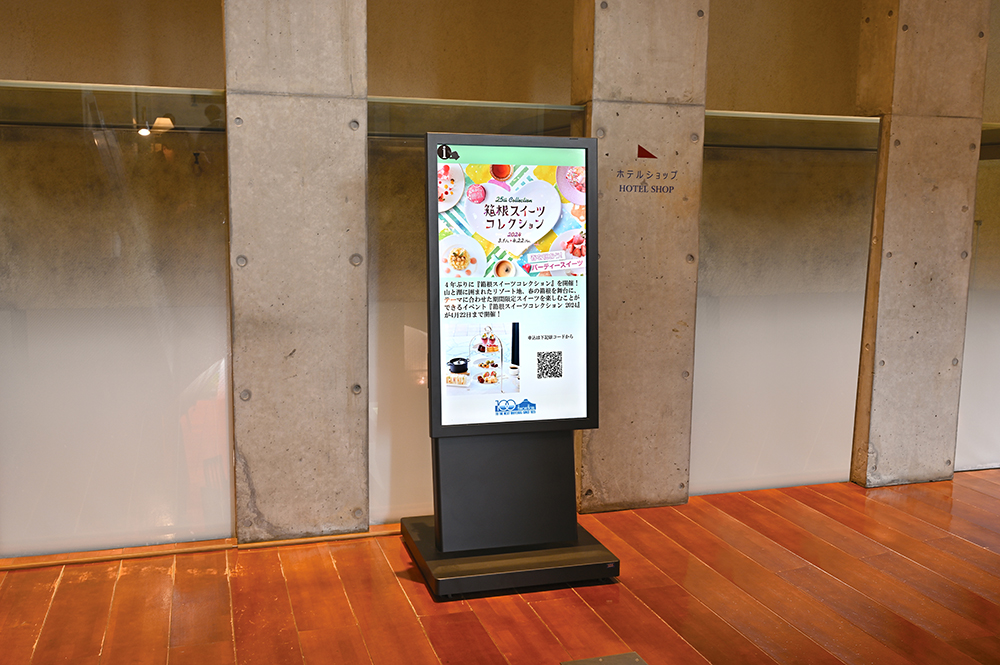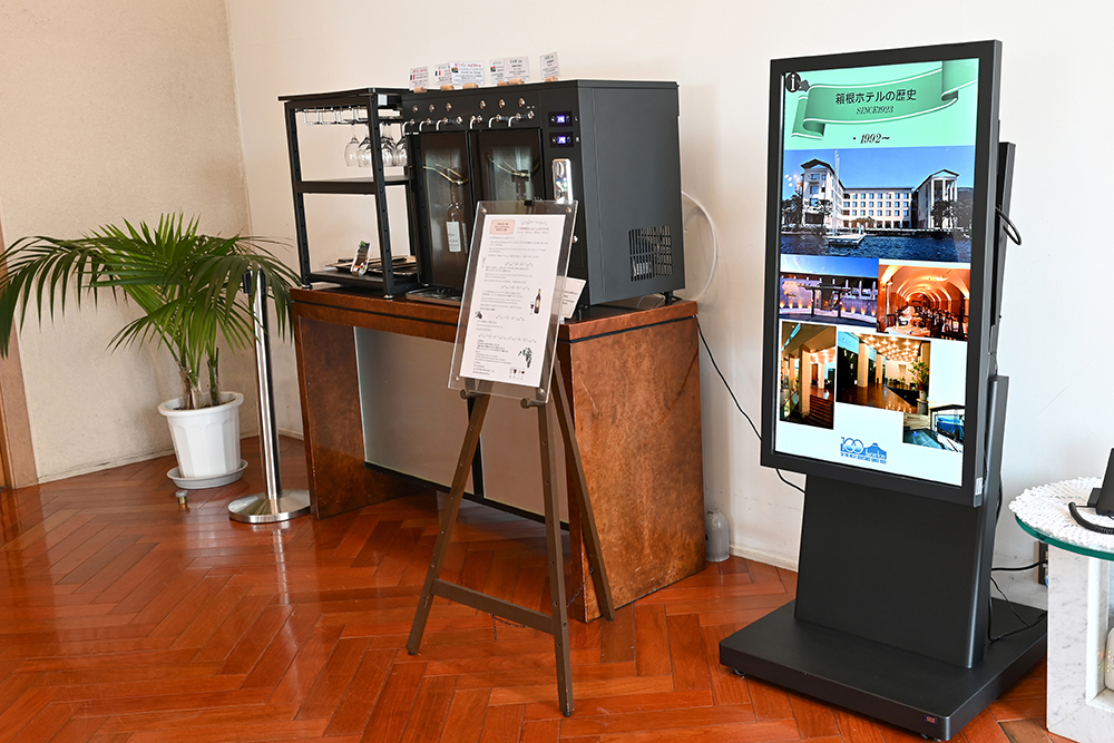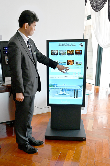 ホテルのロビーと宿泊者専用ラウンジに各1台設置しています。タッチパネル式ディスプレイを採用することで、普段はおすすめの情報を配信する一方、タッチ操作でページを切り替え、今お客様が必要としている情報をすぐに表示することもできるようにしています。