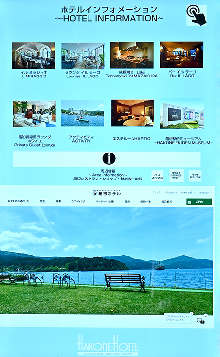 2種類のバスと遊覧船・海賊船の時刻表だけでも8種類ある中、リコーデジタルサイネージに情報を集約できたことで、リゾートホテルに相応しいスマートな形で情報を配信できるようになりました。特に、お客様の目の前で、大画面を操作しながらご案内できる効果は大きいですね。レストランのメニュー詳細や芦ノ湖水上アクティビティのラインナップ、周辺の観光情報といった様々な情報を、視覚的にも分かりやすくご案内できるようになりました。
