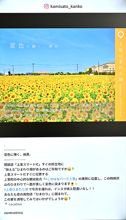 上里町ではSNSの活用に力を入れており、特に産業振興課 産業観光係が運営しているInstagramには、私たち職員でも知らない町の魅力や、隠れた撮影スポットなどが多数投稿されています。これらの情報をInstagramを使用していない人も見ることができるように、Instagram連携機能を使ってリコーデジタルサイネージからも配信しています。最初にInstagramのアカウントを登録しておくだけで、自動的に情報更新が行われレイアウトもバランスよく調整されるので使い勝手がとても良いと思います。