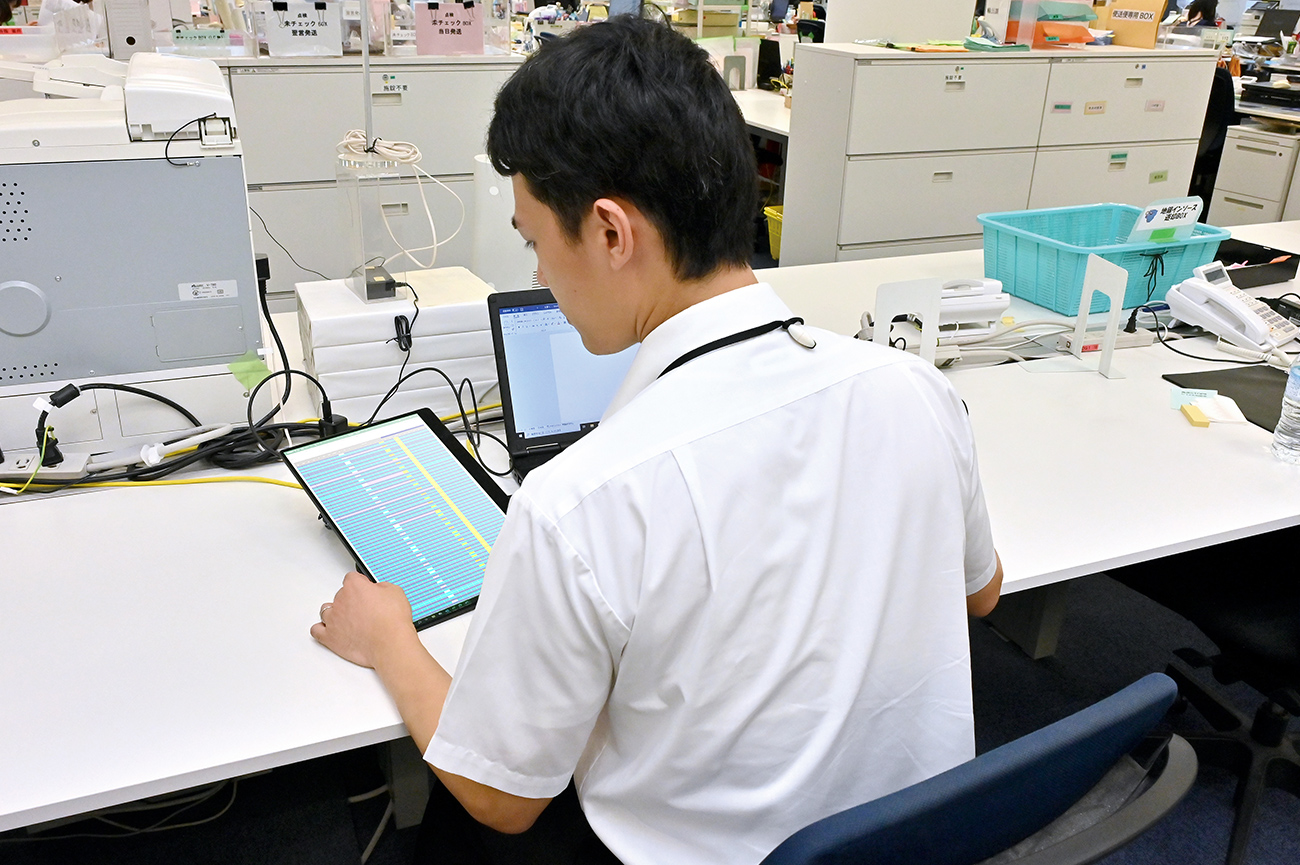 140台を導入し、主に法令点検の業務で使用しています。法令点検は、お客様からお預かりした書類を精査し、必要な項目をシステムへ入力していく業務となります。