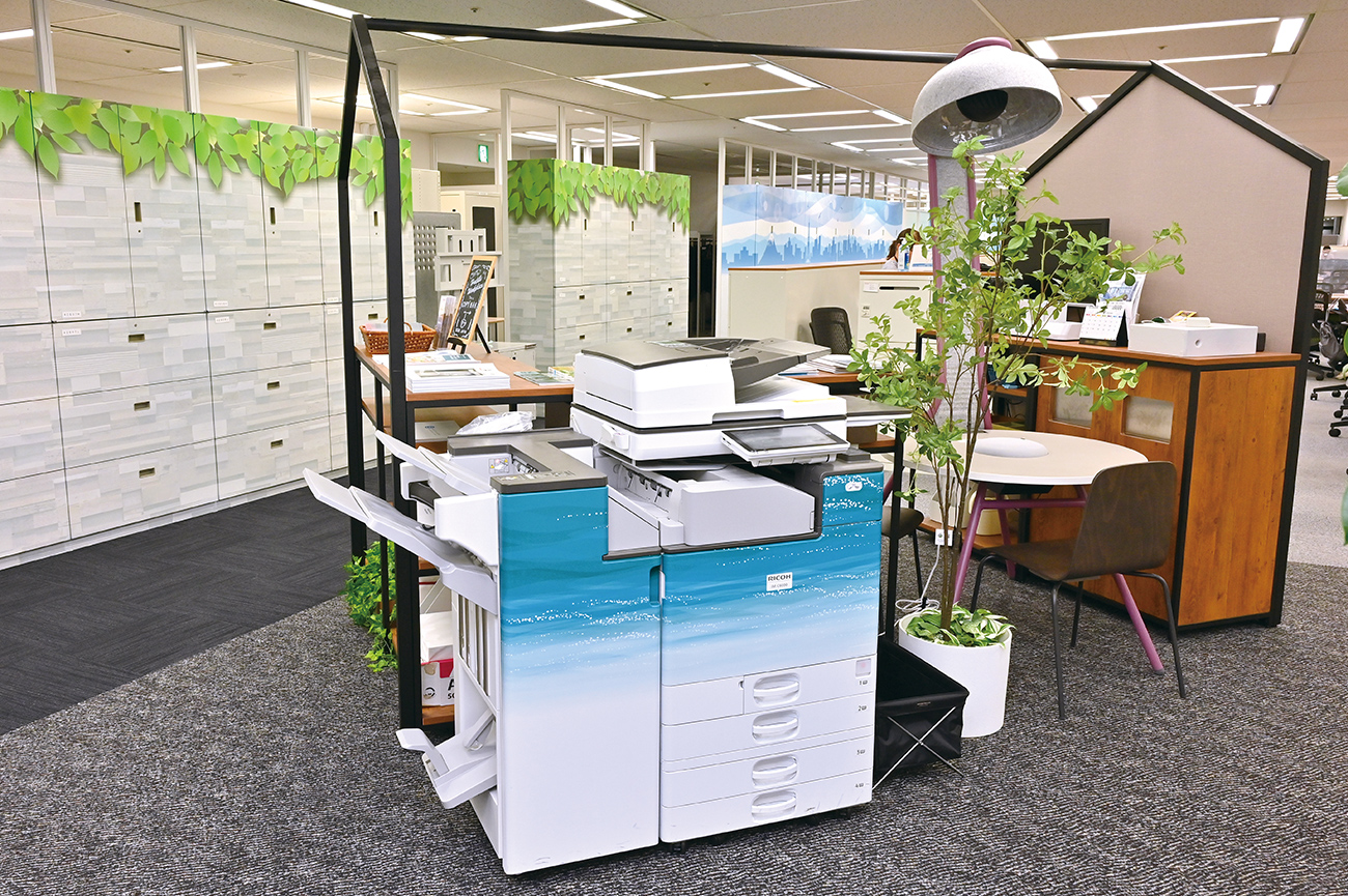 複合機の近くに雑誌やテーブルを配置し、偶発的な⼈、モノ、情報の出会いを創出。