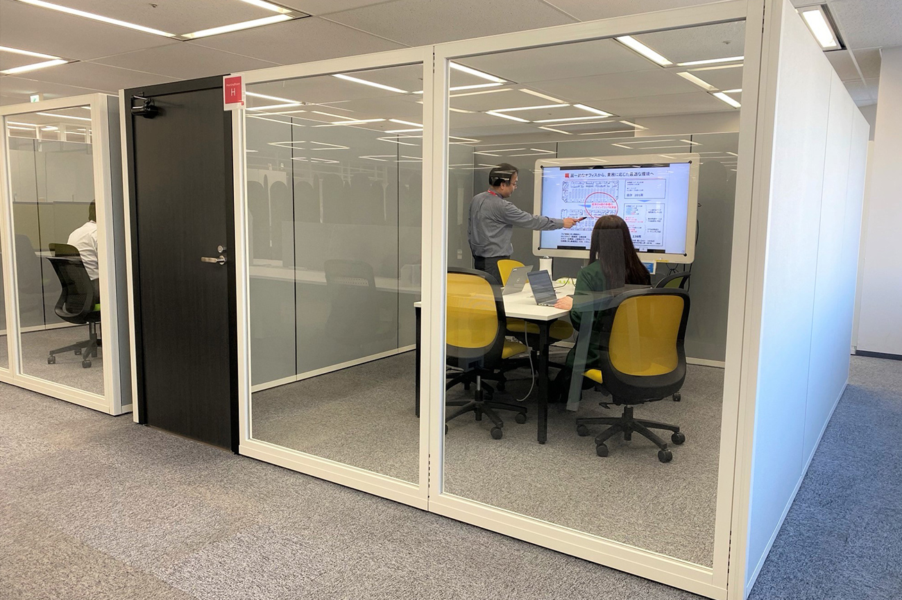 矢島「既存の執務スペースに、B工事※不要なパネルを活用したミーティングルームを構築しました。声の向きを統一したり、パネルを使って個室にすることで、以前のパーティションだけで区切っていた簡易ミーティングルームと比較して、声・音対策が改善されているという感想が社員から寄せられています。社員の満足度をさらに高めていくため、アンケート結果も活用しながら引き続き改善を進めていく予定です。」
