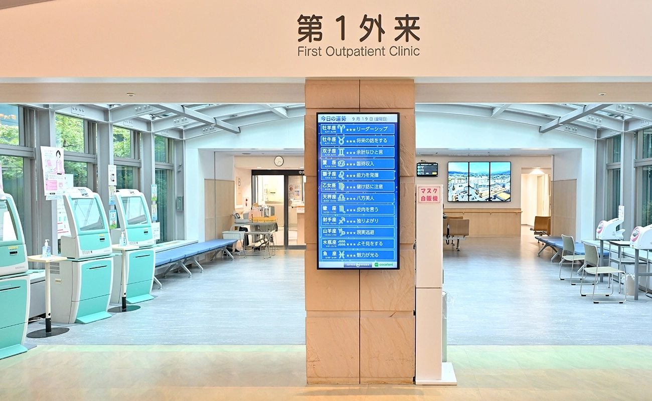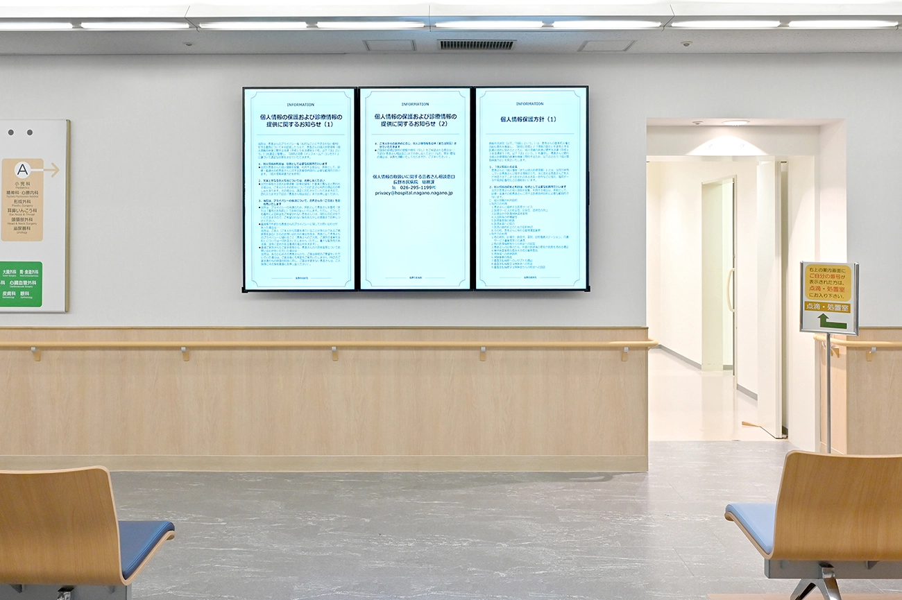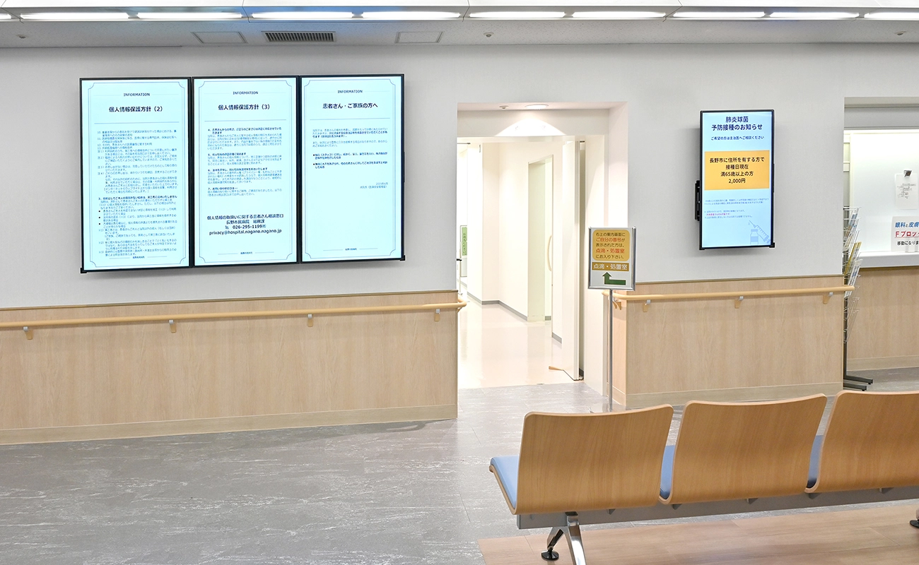 病院には、法律で義務化された院内掲示事項が多数あります。さらに、当院は診療科が多い分、発信したい情報も多岐に渡ります。これらの情報を以前は紙で掲示していましたが、掲示スペースには限界があり、お伝えできる情報がどうしても限られてしまいます。そこで、本館のリニューアルを機に、外来エリアでの情報発信を紙からデジタルサイネージへ切り替えることにしました。