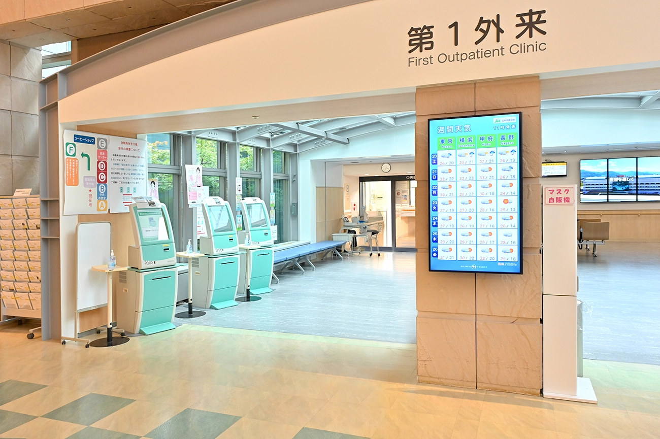 正面玄関入口や外来エリアの待合ロビーを中心に全13台を設置しています。