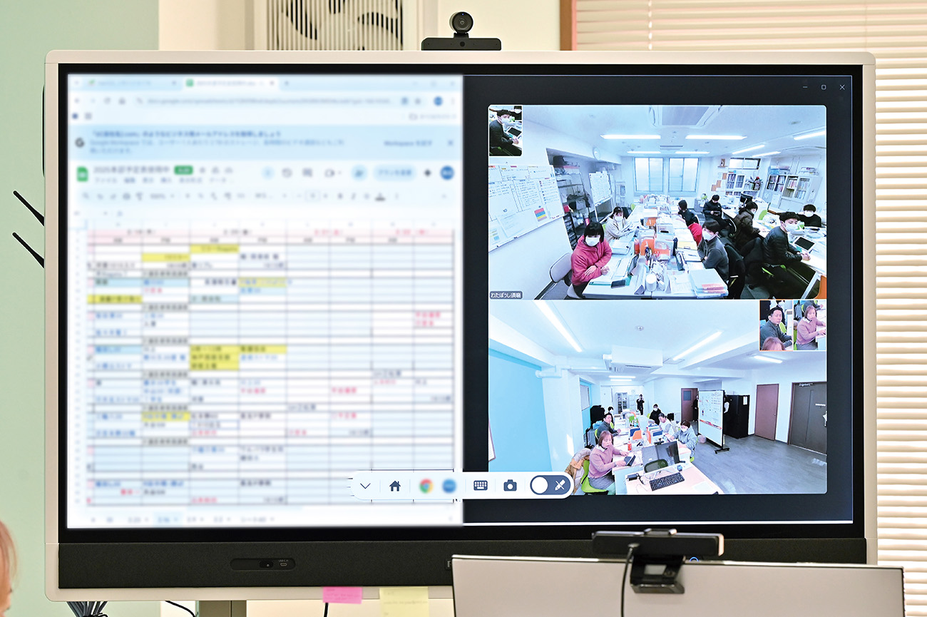 特に、課題となったのが、対面で実施していた朝礼と、その中で行っていたスケジュールの共有をどのようにオンラインで行うかという点です。タブレットのみで朝礼を行う方法もありますが、内蔵のカメラで事務所全体を映すのは困難ですし、ハウリングを防ぐためマイクをオンにできるのは1台のみ。1台のタブレットを回覧して順番に発言する形になります。もっと手軽に臨場感のある朝礼がしたいと考え、電子黒板に興味をもちました」。