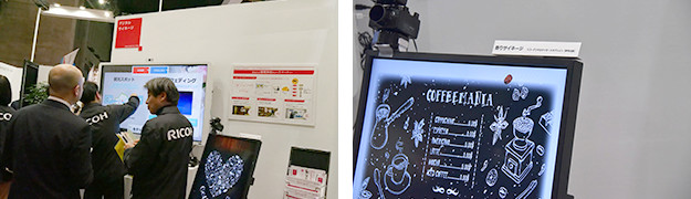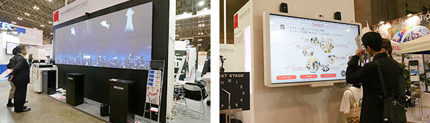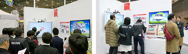 会場ではタッチセンサーにより映像の中の描いた絵に触れて頂きました。またリコーの超短焦点プロジェクターを3台連結し省スペースで大画面の迫力のある映像を体験頂きました。