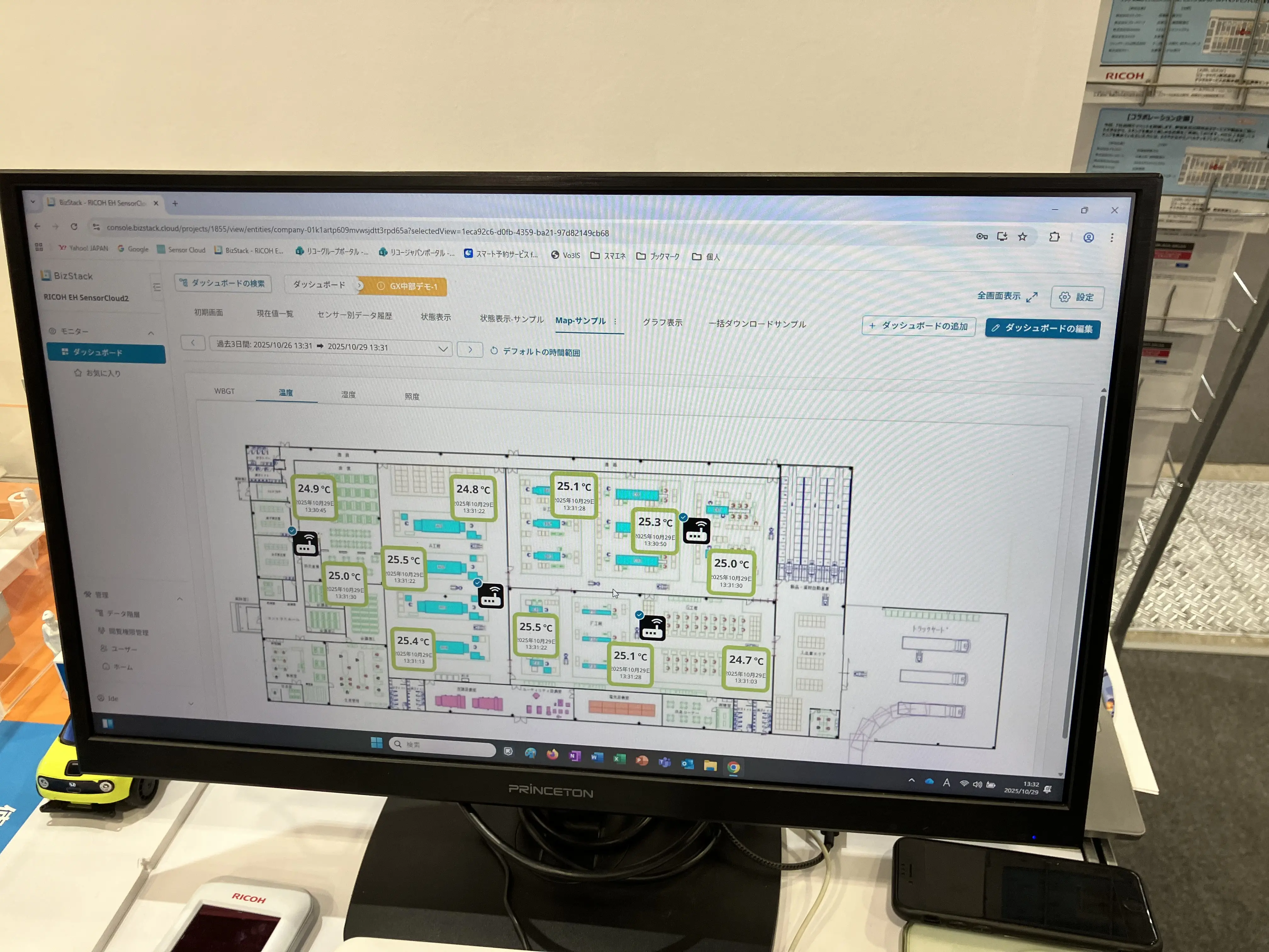 リコーEH環境センサーは温湿度やWBGTを計測できる小型センサーで、 bluetooth経由でゲートウェイにデータを送信、クラウドに送ることで工場内の環境をリアルタイムに把握できる、熱中症対策に有効なソリューションです。