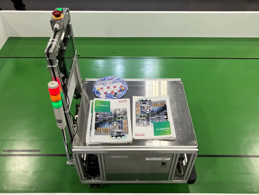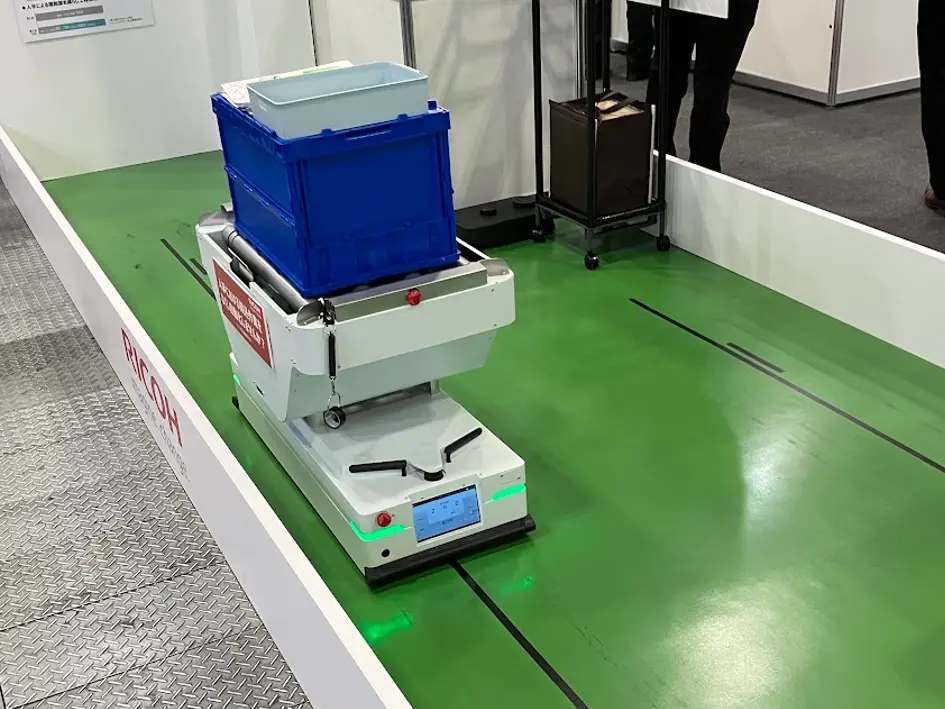 リコージャパンでは「RICOH AGV(無人搬送車)」をご提案しております。AGVの上にモノを置いたり、台車を牽引することで運搬作業を自動化いたします。走路を設定するには、黒色テープを床に貼っていただきます。画像センサーでテープを読み取って走行し、2本線にしたところで停止するなどの制御が可能です。展示会でもテープにより簡単に走路を敷設してデモンストレーションで走行させていました。磁気テープよりも安価に走路の新設、変更が可能ですので、ご興味のある方は是非お問い合わせください。