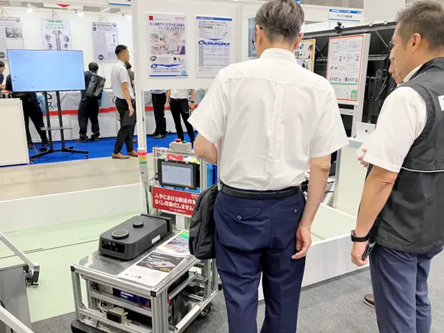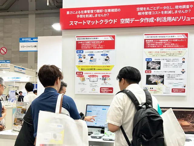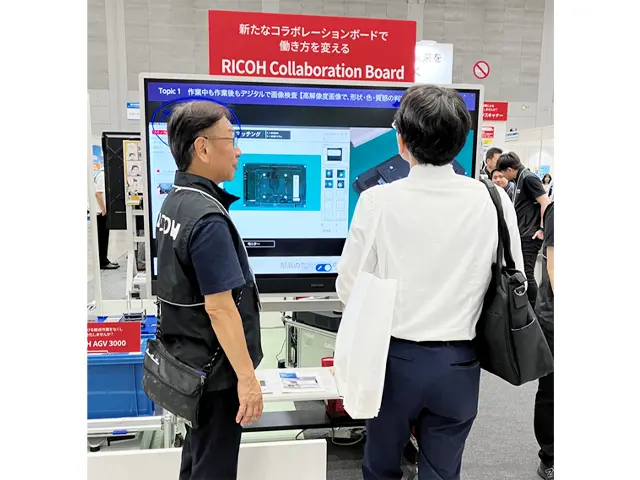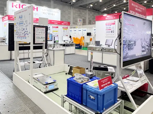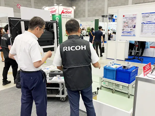 AGV(無人搬送車)は実機による走行、荷物の搬送の動きを間近で見ていただき、「RICOH 無人搬送車 M2」と「RICOH AGV 3000」の特徴でもある光学式を採用し黒色のビニールテープで簡単に走路設計・運行指示ができる点や狭いスペースでも走行可能なコンパクトさ、エレベーター連携や自動移載ユニットなど豊富なオプションがある点は特にお客様からご評価いただけました。