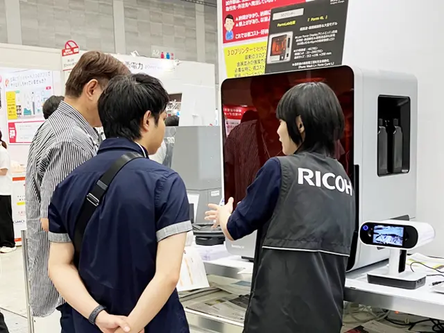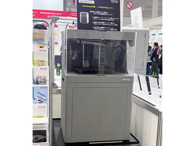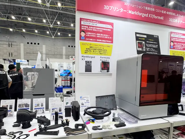 リコージャパンでは多くの3Dプリンター、3Dスキャナーのお取り扱いがありますが、今回は人気が高いカーボンファイバー対応の生産性を重視した産業向け3Dプリンター「Markforged X7」と高速・高精度・信頼性を兼ね備えた大型光造形3Dプリンター「Formlabs Form4L」の実機と導入されているお客様の工場内設備部品や工場部品の造形サンプルを展示しました。