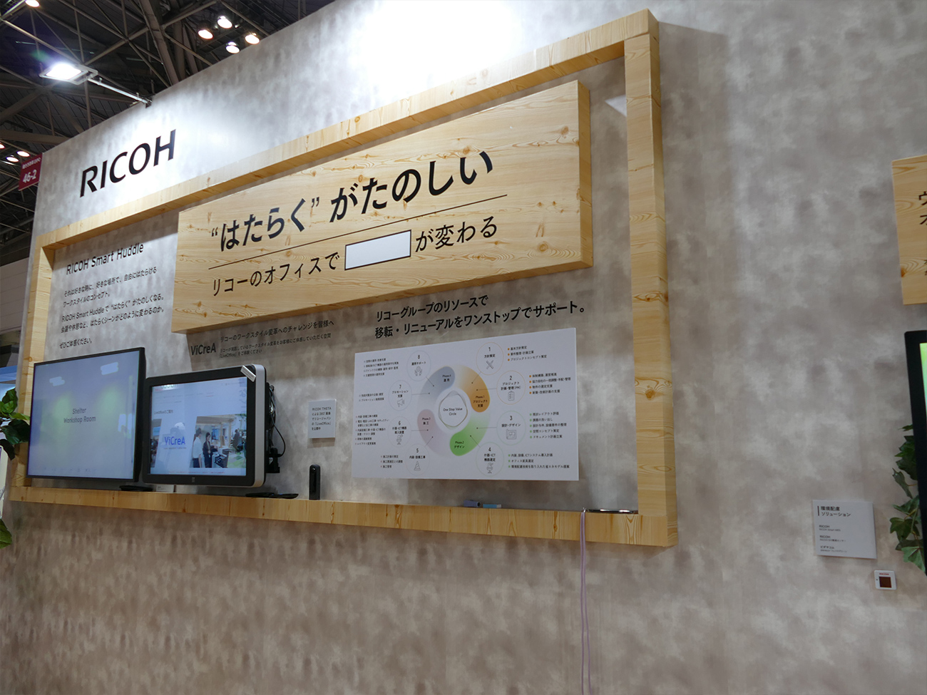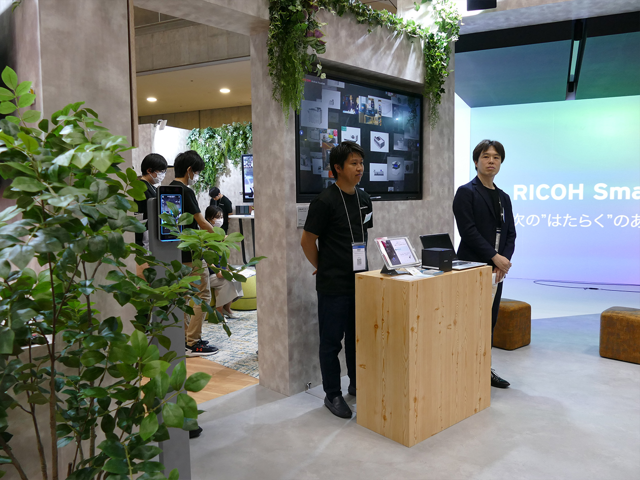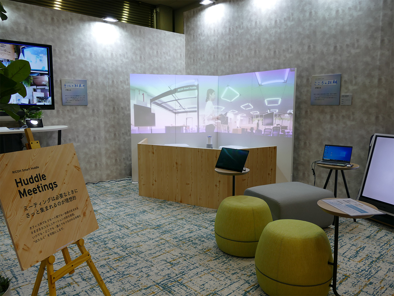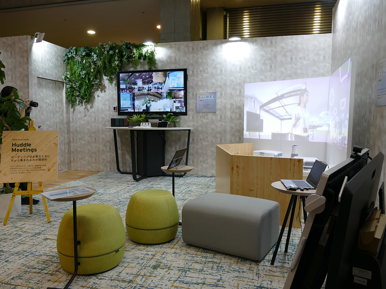 「次の“はたらく”のあたりまえを創る / RICOH Smart Huddle」をコンセプトとして、デジタルサービスとワークプレイスデザインの相乗効果でお客様ごとに最適な⽴案をするオフィス空間を展⽰いたしました。