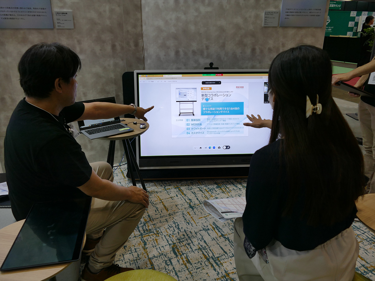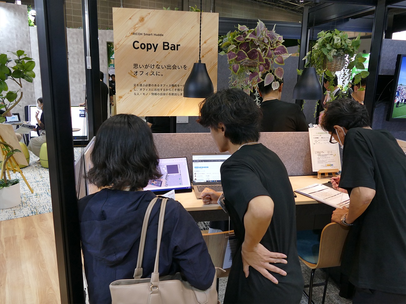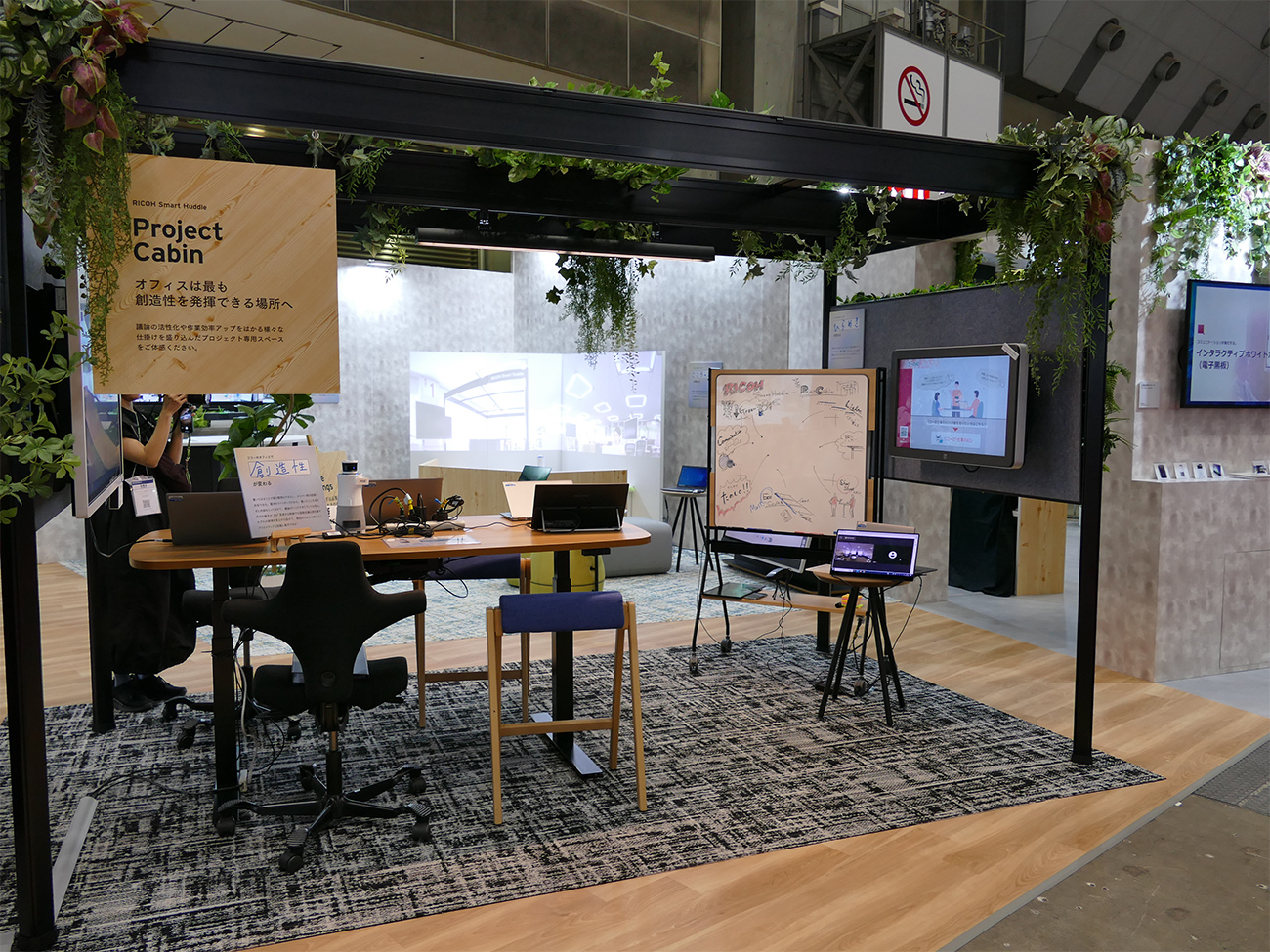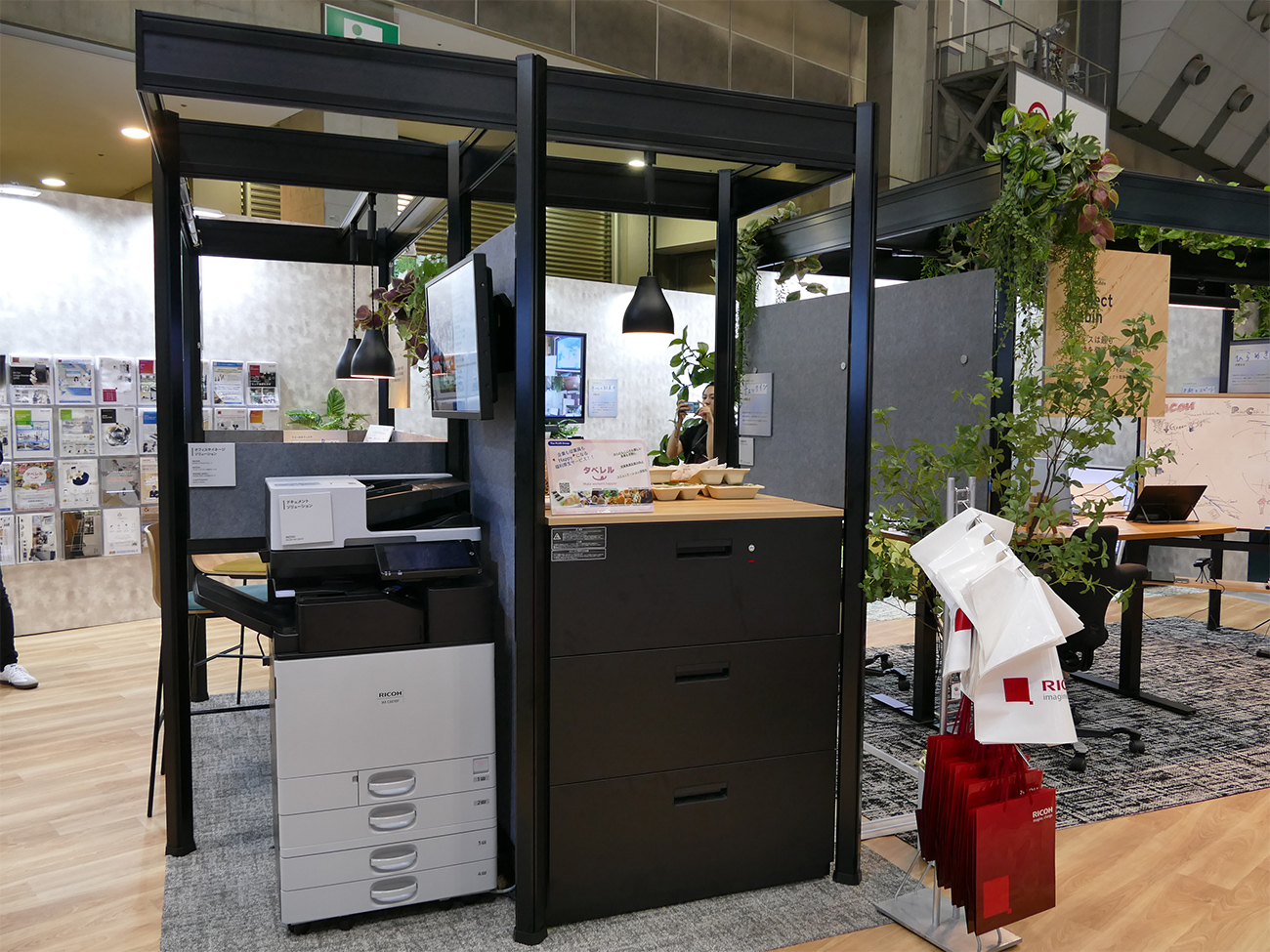 「次の“はたらく”のあたりまえを創る / RICOH Smart Huddle」をコンセプトとして、デジタルサービスとワークプレイスデザインの相乗効果でお客様ごとに最適な⽴案をするオフィス空間を展⽰いたしました。