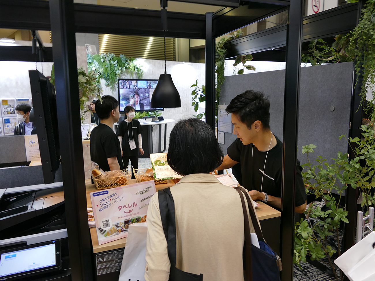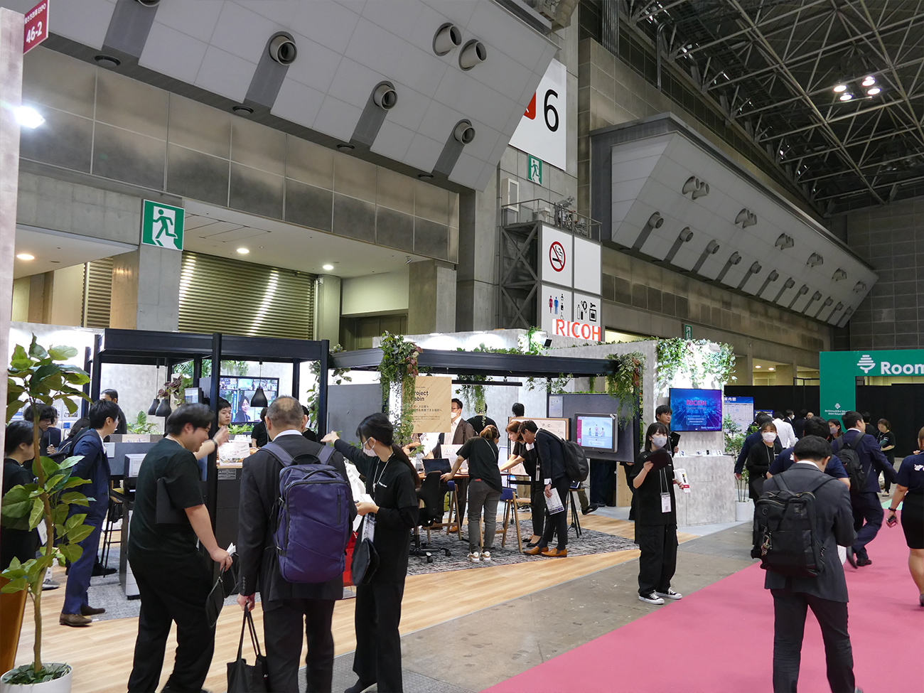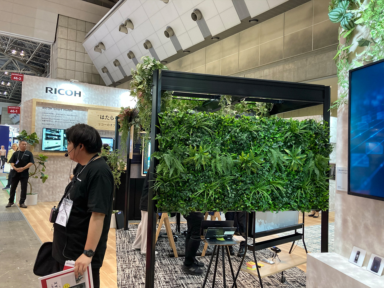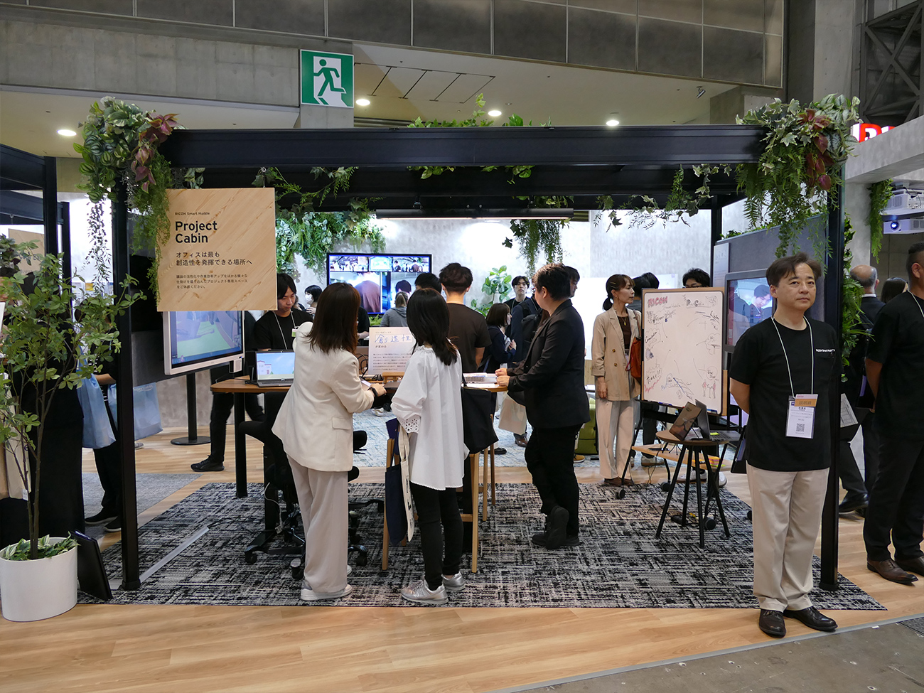 「次の“はたらく”のあたりまえを創る / RICOH Smart Huddle」をコンセプトとして、デジタルサービスとワークプレイスデザインの相乗効果でお客様ごとに最適な⽴案をするオフィス空間を展⽰いたしました。