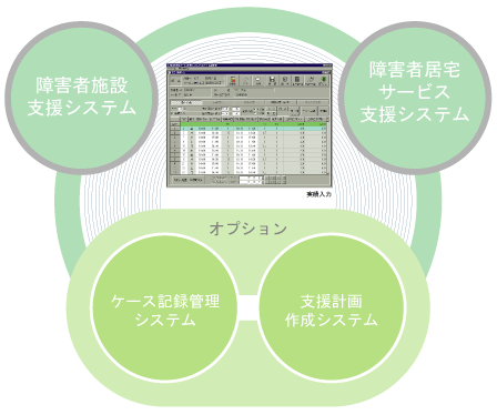 自立支援給付に関する情報管理と請求機能を持つ基本システムと、その活用範囲を広げるオプションシステムによる、事業所管理のトータルシステムです。
