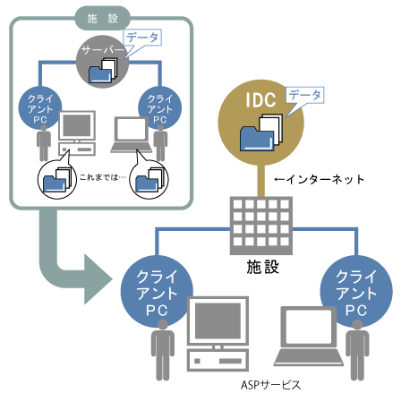 「ワイズマンIDCシステム」とはインターネットを通じて様々なアプリケーションソフトをご利用いただけるサービスです。アプリケーションソフトは、IDC(インターネット・データ・センター)と呼ばれるセキュリティ対策万全の専用施設に導入されているため、お客様側でサーバーを設置する必要はありません。また、データのバックアップやシステムのバージョンアップはすべてIDCで行うため、わずらわしい作業の手間をかけることなく、低コストで、常に最新の状態で安心してシステムをお使いただくことができます。
