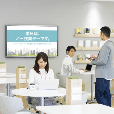 デジタルサイネージにより、PCを持たない従業員の方にもタイムリーに非接触で情報発信することができます。