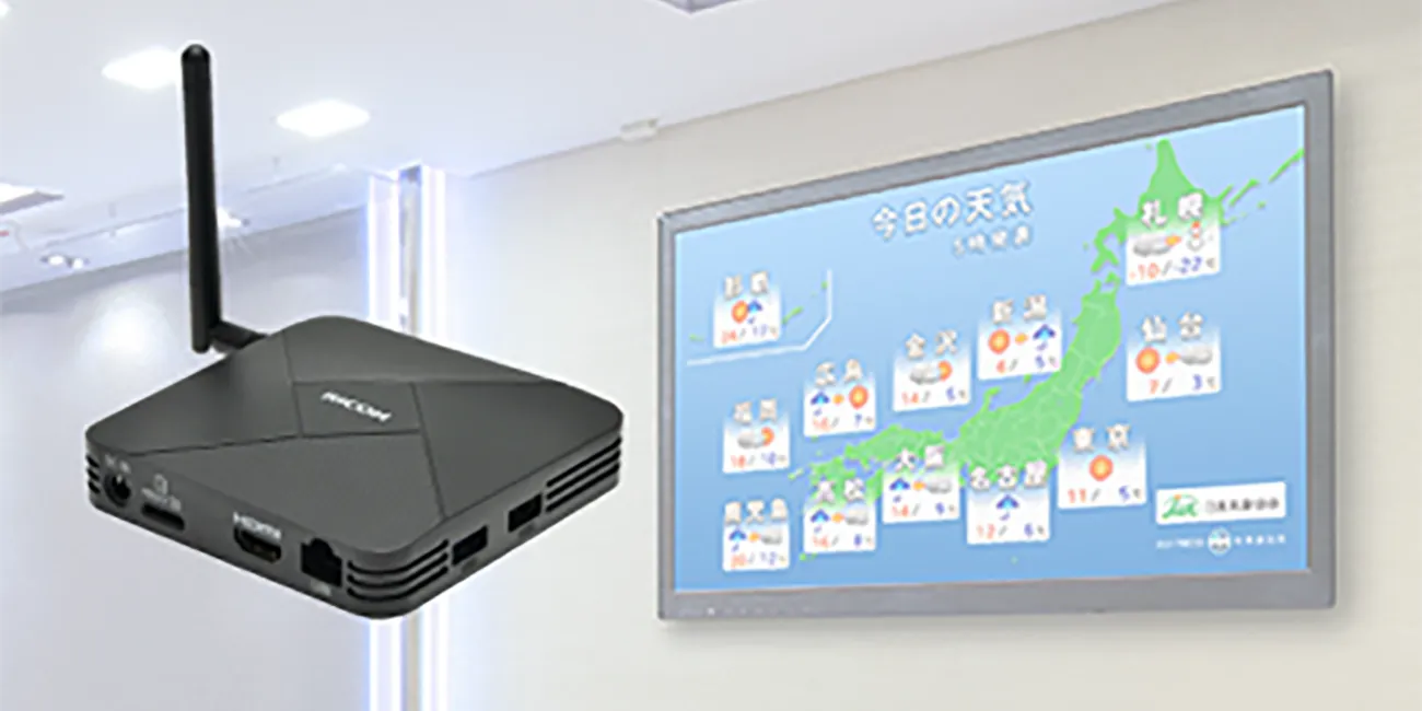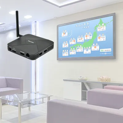 小型STBを通じて遠隔から情報発信ができるクラウドサービスです。天気予報・ニュースなどのコンテンツが豊富で運用も簡単です。