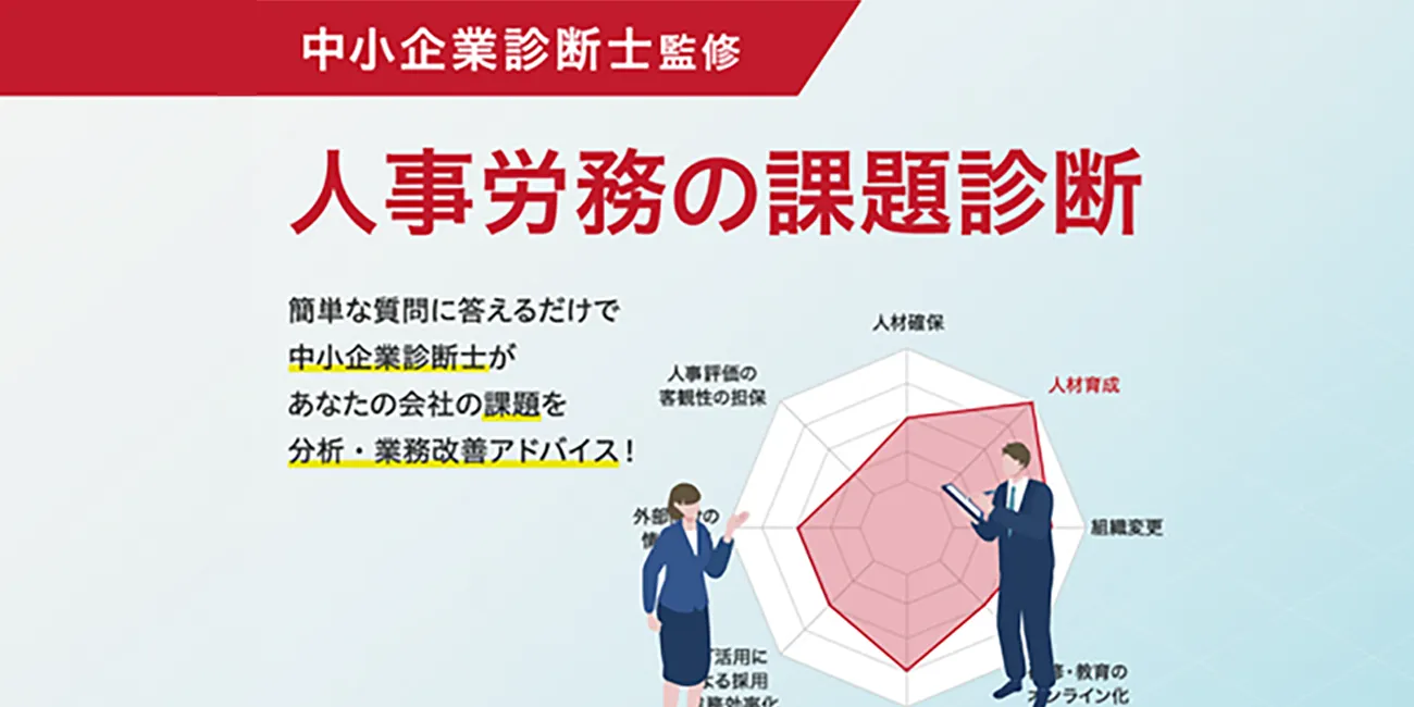 中小企業診断士監修。簡単な質問に回答するだけで、人事労務の課題・対策がまるわかり!