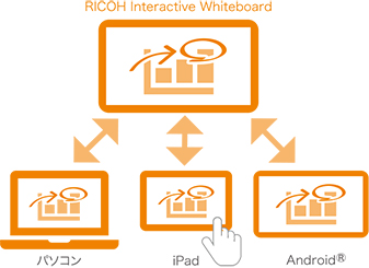 RICOH IWBに表示されている画像をワイヤレスでタブレット端末へ共有することができます。さらにタブレット端末からの書き込み・写真データのアップロードが可能になり、リアルタイムに相互の書き込み内容を反映させることができます。また、タブレット端末をビューワモード(書き込みなどを行わない見るだけのモード)に設定することで、うっかりプレゼンが邪魔をされることを防止することも可能です。