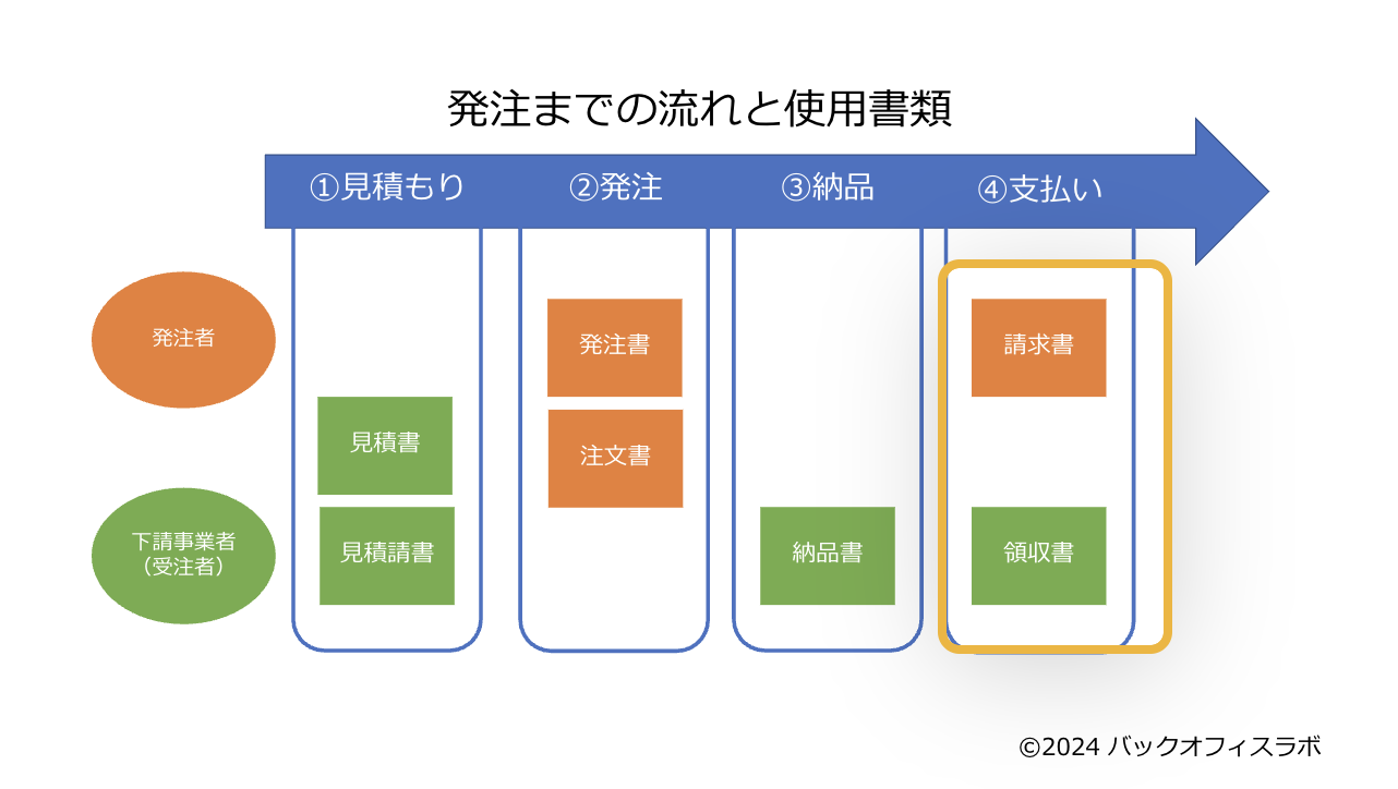 発注者側が検品作業を終えたあと、受注者側から発行された「請求書」をもって支払い手続きをします。そして支払いを確認した受注者から「領収書」を受け取り、取引は終了します。