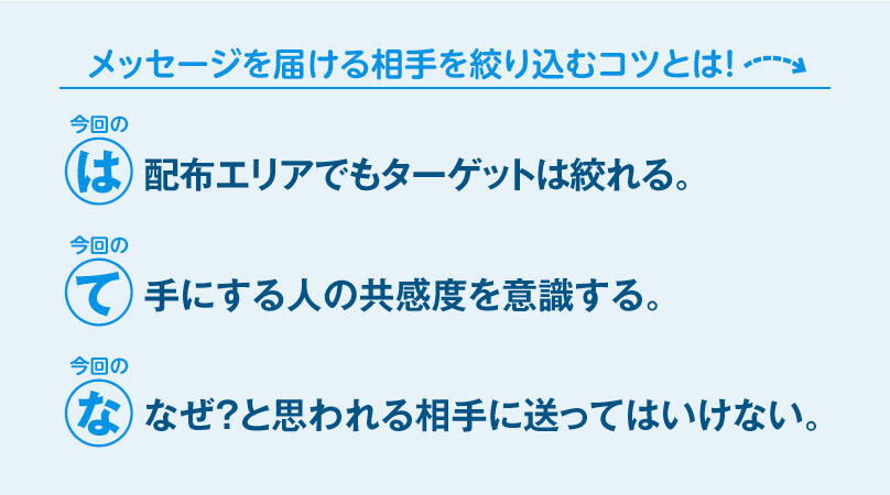 ここが今回のDMの残念だった点です。新婚夫婦もこの点に疑問を持ち、結果的に話のネタにされるだけに終わってしまいました。ポスティングを利用する際はDMの作りも大切ですが、配布する対象のセグメントが重要です。大まかな条件であっても「ここは押さえておくべき」という点を見極めておかないと、せっかくのツールの効果が半減してしまいます。
