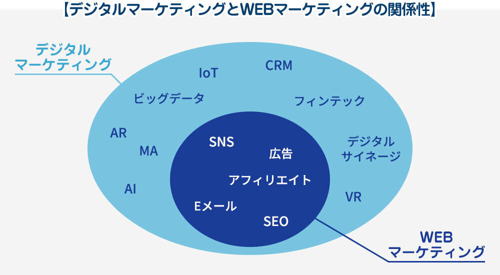 Webマーケティングはデジタルマーケティングの中でもよく知られている手法です。前述のとおり、デジタル技術を駆使したマーケティング手法は基本的にすべてデジタルマーケティングに含まれます。よって、Webマーケティングもデジタルマーケティングの一種です。