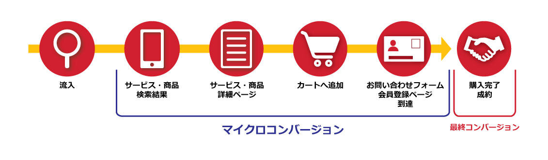 たとえば、オンラインショップ(ECサイト)であれば商品購入、企業サイトや商品情報サイトであれば問い合わせや資料請求、セミナーイベントの情報ページであれば申し込みなどがコンバージョンに当たります。何を成果とするかの基準は企業やサイトの運営目的によってまちまちです。いずれにしても、WEBサイトのパフォーマンスを把握する上でコンバージョン率は重要な指標といえます。