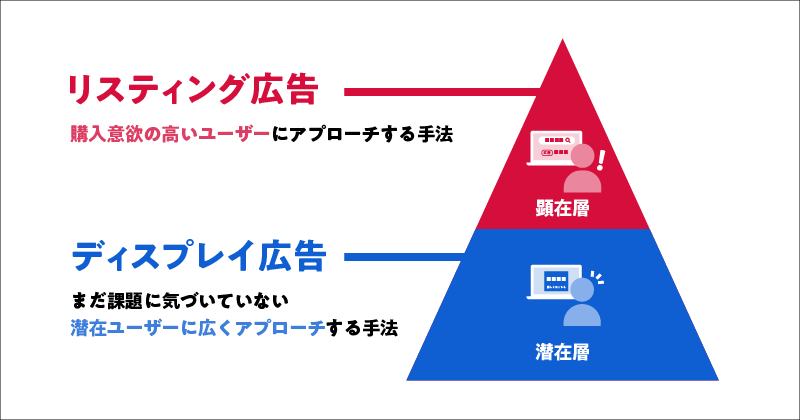 このように、ディスプレイ広告とリスティング広告は優劣をつけられるものではなく、特性が異なる広告手法と捉える必要があります。広告施策の目的や訴求すべきターゲットに応じて適切に活用していくのがポイントです。