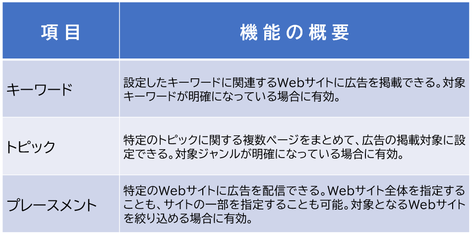 Webサイトの内容(コンテンツ)に対応したターゲティング方法として、次のような項目を設定できます。