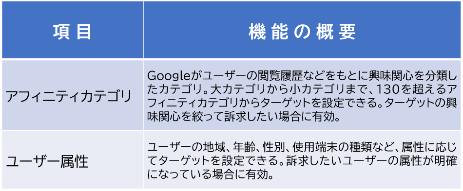 Googleディスプレイネットワークにおけるターゲティング手法は多岐にわたります。そのうち、主なターゲティング手法は下記のとおりです。