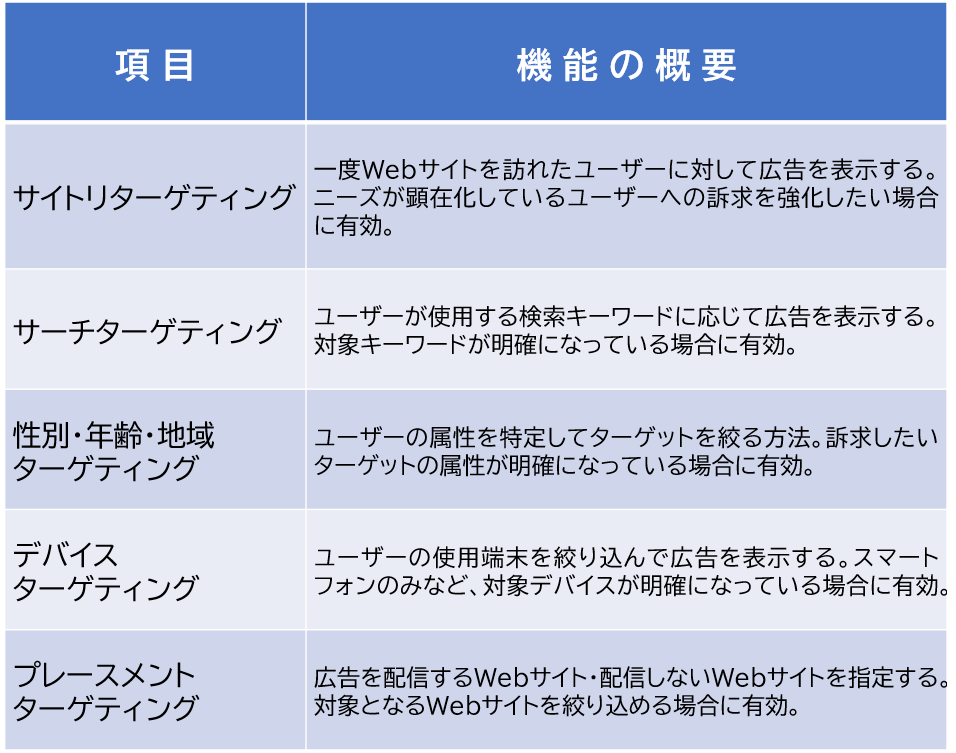 Yahoo!広告 ディスプレイ広告(運用型)のターゲティング方法は下記の5つです。