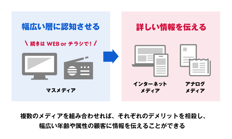 テレビやチラシ、WEB広告などの複数のメディアを組み合わせれば、異なる年齢や属性の顧客にも情報を伝えることができます。インターネットの情報が中心の若年層と、ネットはあまり利用しないけれど新聞やテレビはよく見る中高年層などターゲットが異なる場合にも有効です。