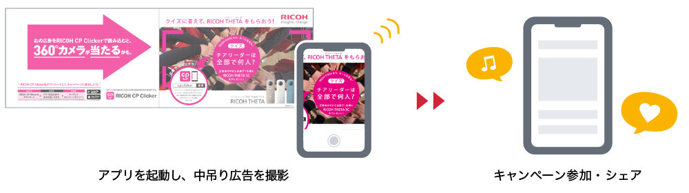 スマホアプリの「RICOH CP Clicker」を無料ダウンロードして、電車内の中吊り広告の画像をアプリで読み込むと、キャンペーンサイトに飛び、プレゼントに応募できるという流れです。