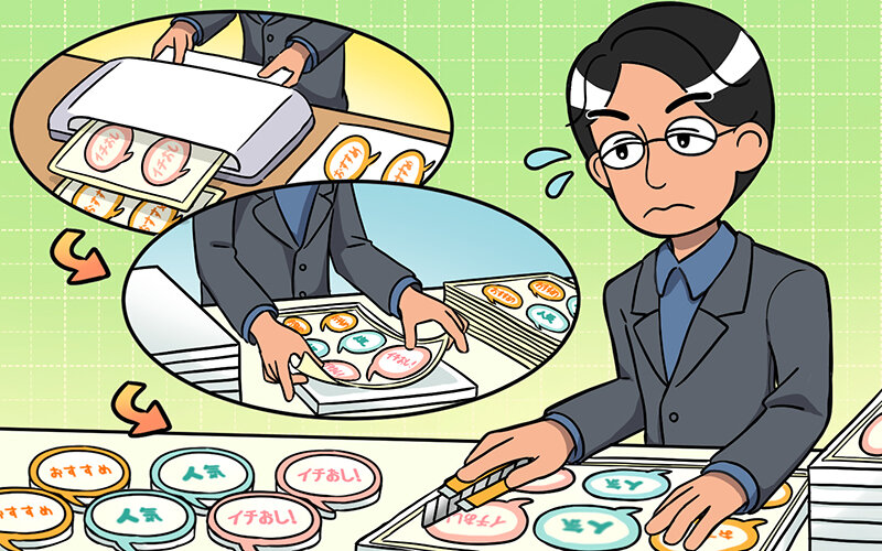 商品の魅力や季節性を伝えるPOPは、お店での販売促進に欠かせないツール。だからこそクオリティにこだわりたいけど、POP制作業務には悩みが多いのも現実です。外注印刷は時間もお金もかかるし、まとめて発注すると在庫のムダが発生。自分で作るにしても切ったり、貼ったり、組み立てたり…。生鮮食品売り場には、水気に強いPOPにするためラミネート加工も必要です。POP制作を効率化する良い方法はないでしょうか?