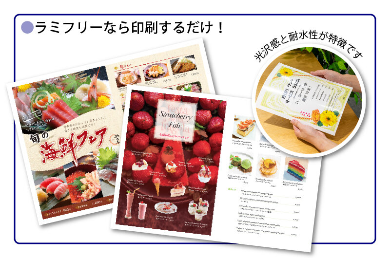 長尺や型抜きのほか、A4サイズやA3サイズなどの一般的なタイプも揃っているため、飲食店などのメニュー印刷にも最適です。屋外用など水気対策が必要な販促物を作るときも、ラミネート加工の手間が大幅に削減できます。