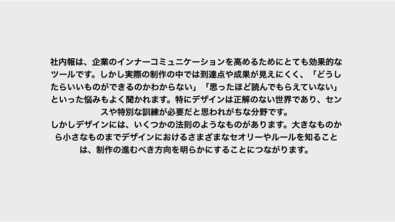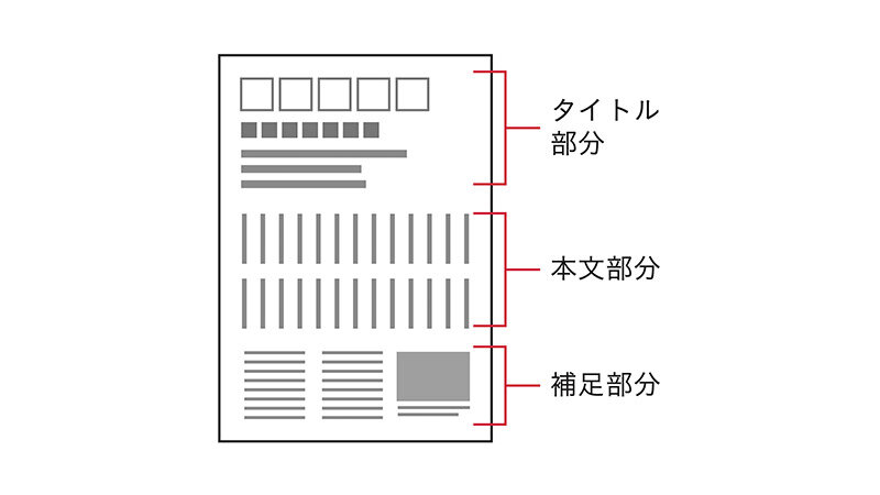 どのような制作物でも基準になるのは「本文」です。タイトル部分は本文よりも大きく、補足部分は本文より小さくします