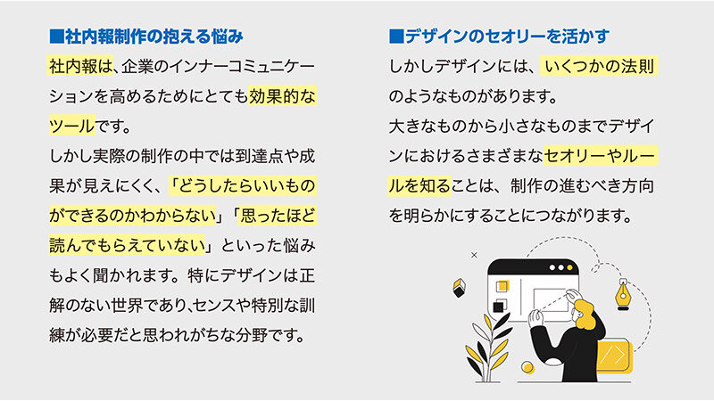 内容をわかりやすくするには、文字の読みやすさだけでは足りません。よりわかりやすい構造に編集し、効果的にビジュアル化したりビジュアルと組み合わせる必要があります。特に長い文章は単に文字を並べるだけでは伝わりません。