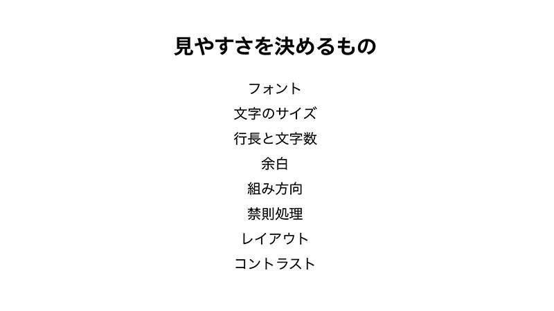 文字の見やすさを決めるのが、これらの要素です。特にフォントやサイズ、行長、余白といった要素は、文字の見やすさに大きな影響を与えます