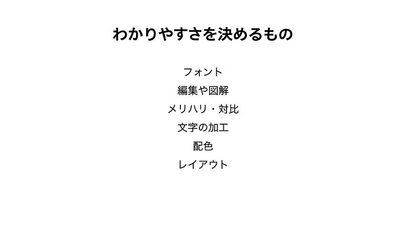 フォントやレイアウトなど、「見やすさ」と共通する要素もありますが、「わかりやすさ」のためにはこれらの要素のデザインが重要です