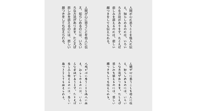 縦組みの文章例です。漢字ややや大きく、かながやや小さくデザインされた明朝体(右上)は文章にリズム感を与えて読みやすくなります