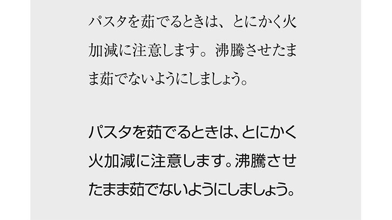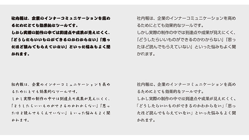 横組みの文章例です。こちらは左から右へと視線を流した際にラインが感じられるゴシック体(右上)が読みやすく感じられます