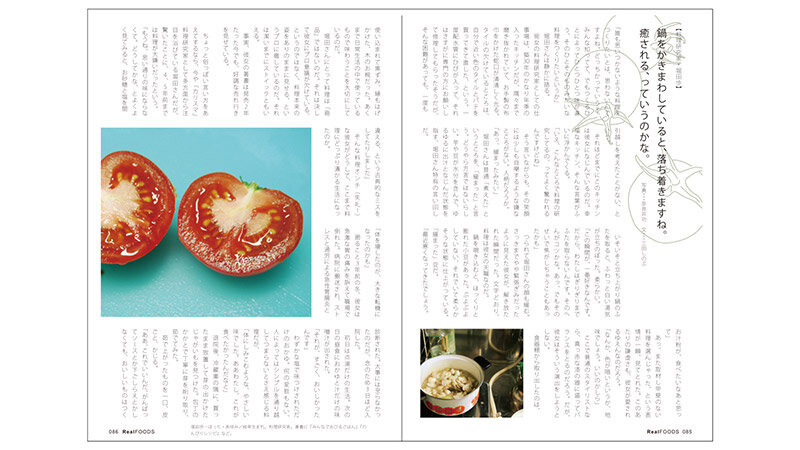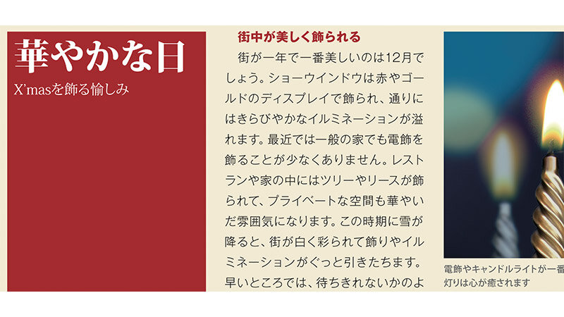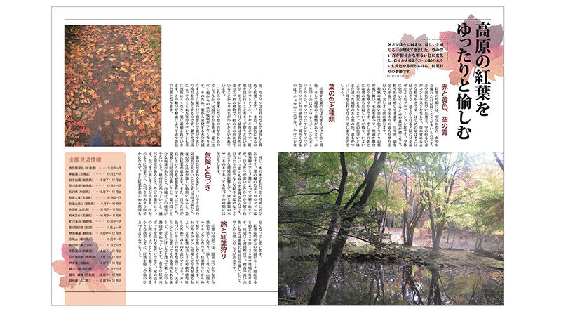 何の手掛かりもなく長い文章を読むのは苦痛です。「紅葉」や「ゆったり」した印象を写真でも表現している例です。文章と図版とが補い合うような編集・デザインを考えます
