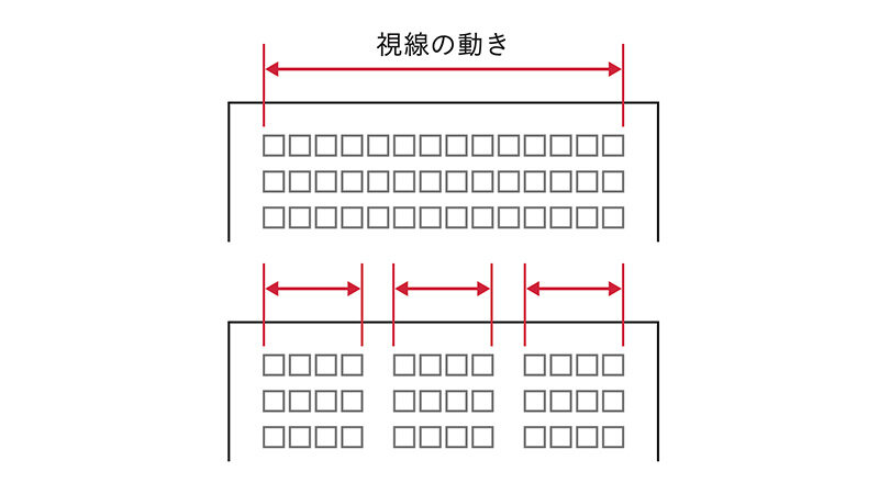 行長が長くなれば、視線の移動距離も長くなります。小説のような文章の場合は途切れさせないために長めにしますが、ニュースや情報系の内容は短く折り返した方がよいでしょう