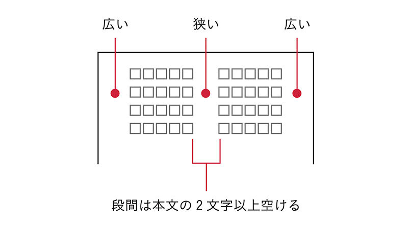 段間はマージンよりも狭くするのが基本ですが、2文字分以上あけないと読みづらくなります