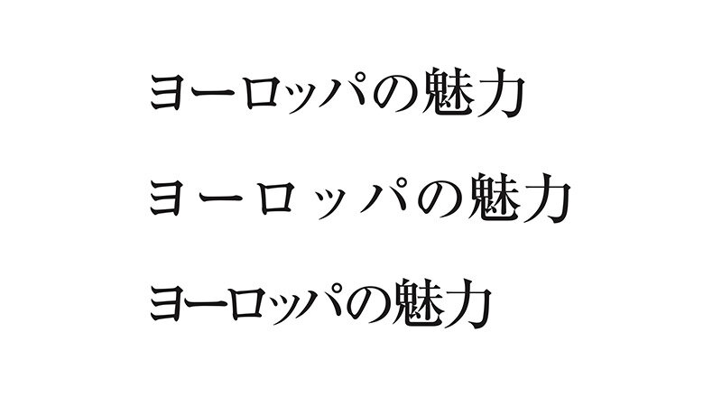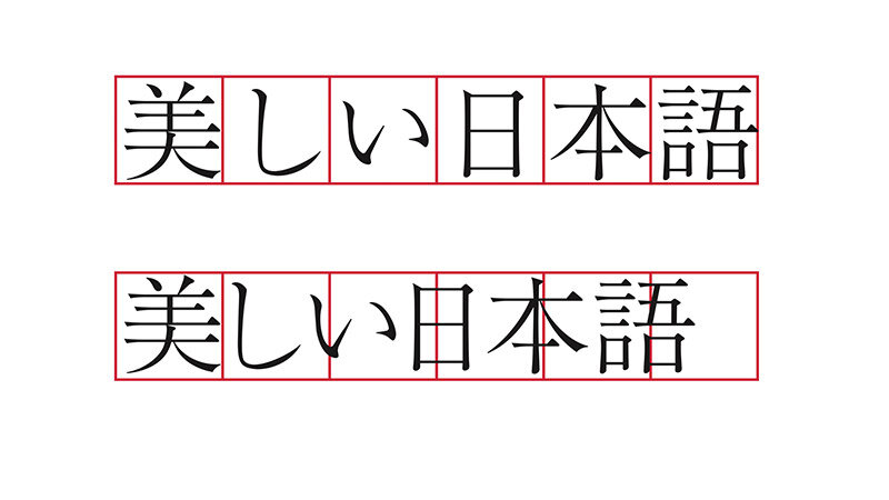 日本語は原稿用紙のように四角の枠の中に1文字ずつ入るよう作られています。このため横組みにした場合に漢字と漢字の間は狭く、ひらがなやカタカナの前後は間隔がひらいてしまいます。これを解消するのが文字詰めと呼ばれる作業(下)です