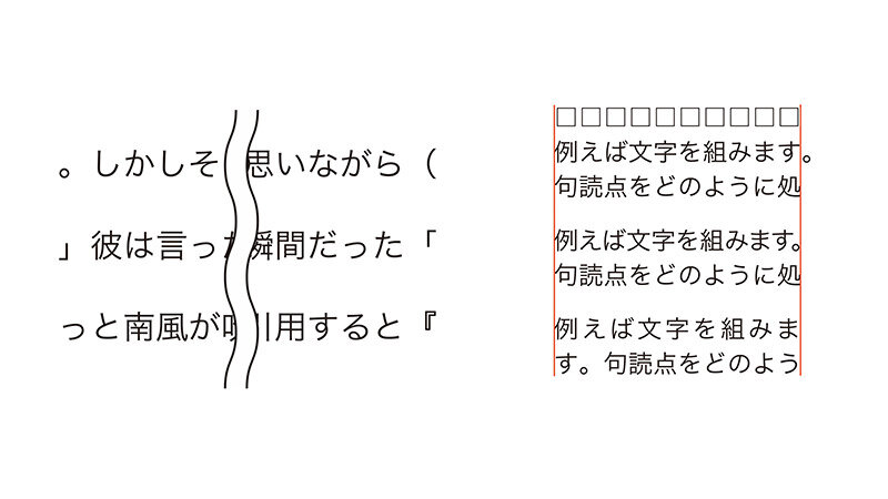 左は行頭・行末禁則と呼ばれる処理を行わなかった例です。右はその禁則をどう処理するのかの例(上からぶら下がり、追い込み、追い出し)です