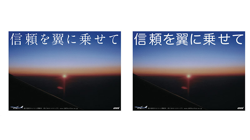 文字詰めをしたもの(左)と、していないもの(右)の比較です。商業印刷の場合は文字間を調整するケースが多く、デザインの完成度を高めています