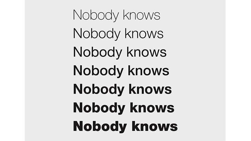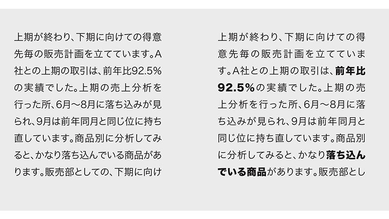文字でメリハリを出すには、太さが重要です。文字の線の太さを「ウエイト」と呼びます。和文書体でもウエイトのバリエーションを持つものが増えています
